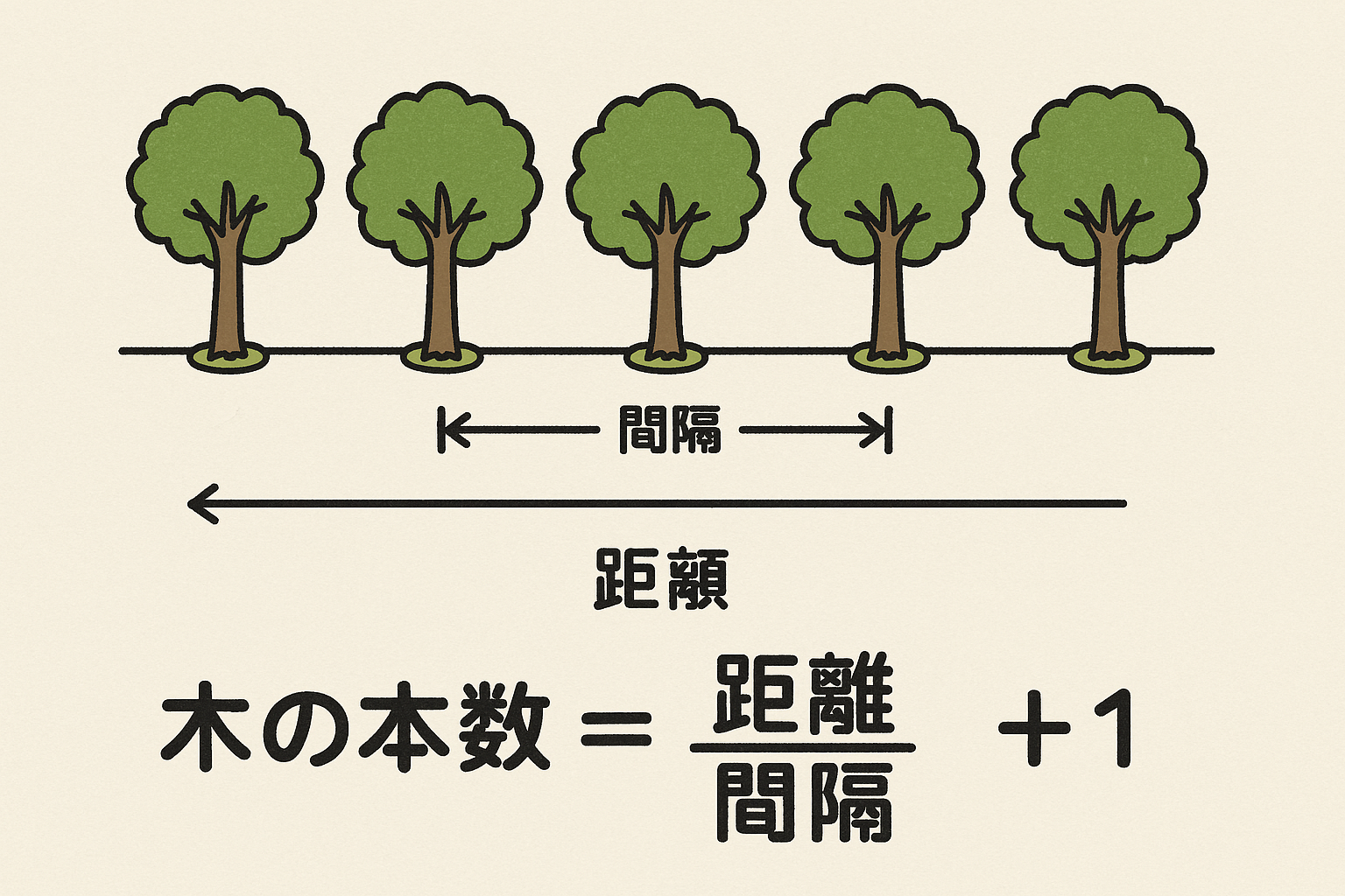 朚の本数 = 距離 ÷ 間隔 + 1